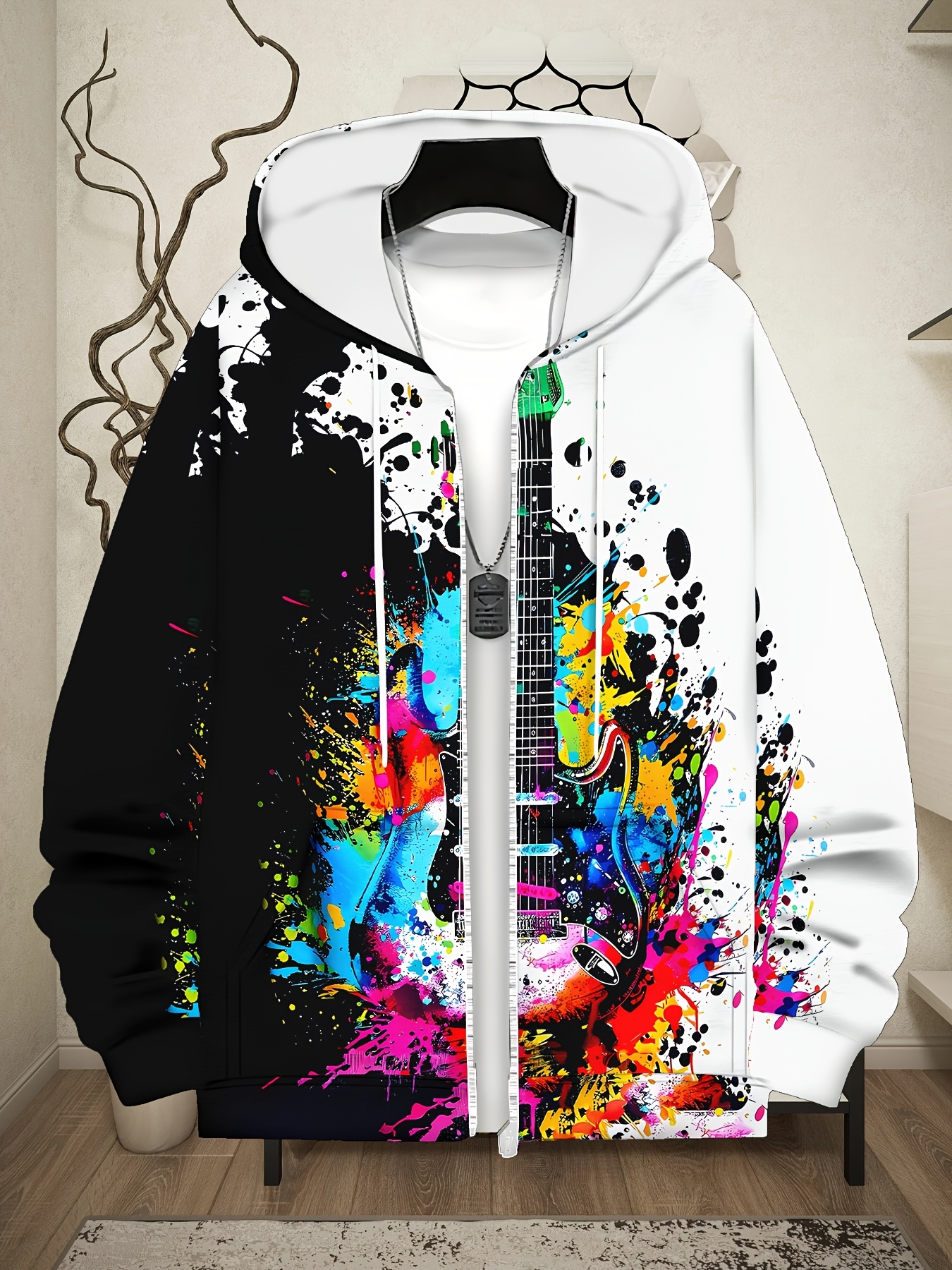 Men'S Vibrant Guitar Print Hoodie - Long Sleeve Zip-Up Sweatshirt with Drawstring & Pockets, Casual Outdoor Fall/Winter Jacket, Black with Colorful Splatter Design, Music Lover Apparel | Hooded Sweatshirt | Durable Fabric
