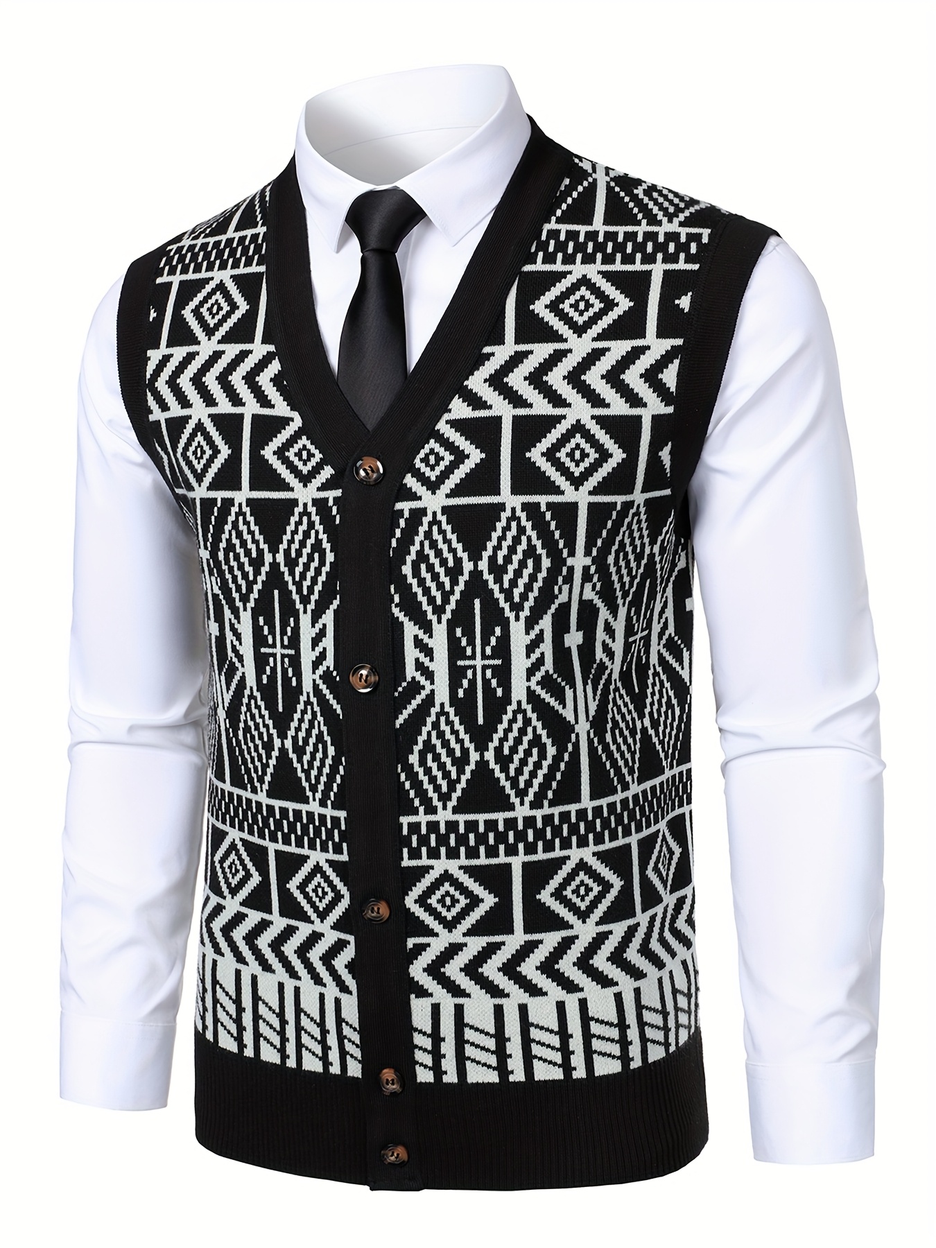 [Casual Cardigan Vest] Casual Color Block Men's Plaid Knit Cardigan Vest | Sleeveless, Regular Fit, V-Neck with Buttons - for Spring/Fall
