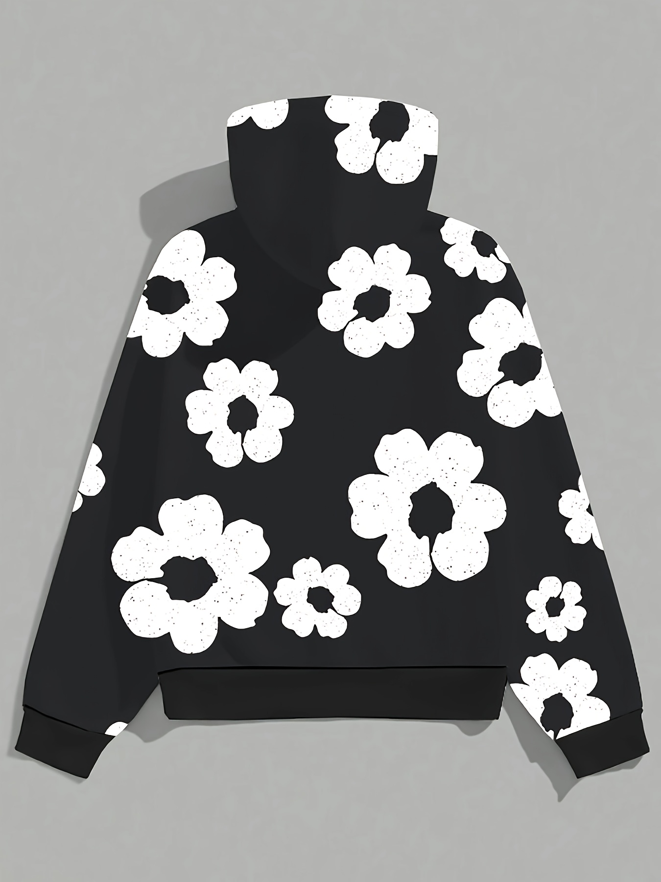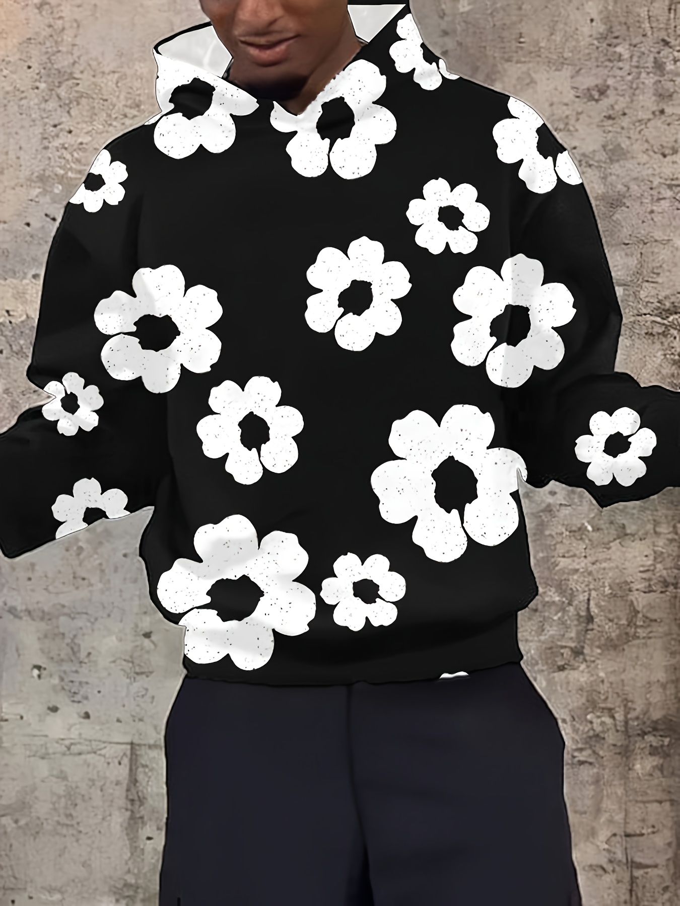 Men'S Casual Black Hoodie with White Floral Print - Trendy Long Sleeve Pullover, Regular Fit, Slight Stretch Fabric, Casual Wear Hoodie|Floral Print Hoodie|Stretchy Fabric Hoodie, Hoodie, Sweatshirt, Sweatshirt Set, Sweatshirt Set for