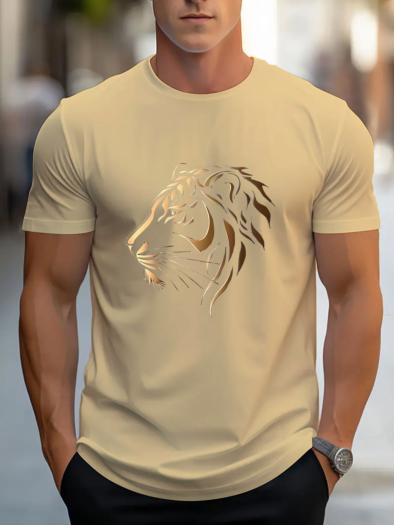 Men'S Stylish Lion Graphic T-Shirt - Brown with Golden Accent Design, Casual Summer Wear, Lightweight Polyester Fabric, Round Neck, Machine Washable, Casual Summer Top|Round Neck Shirt|Polyester Fabric