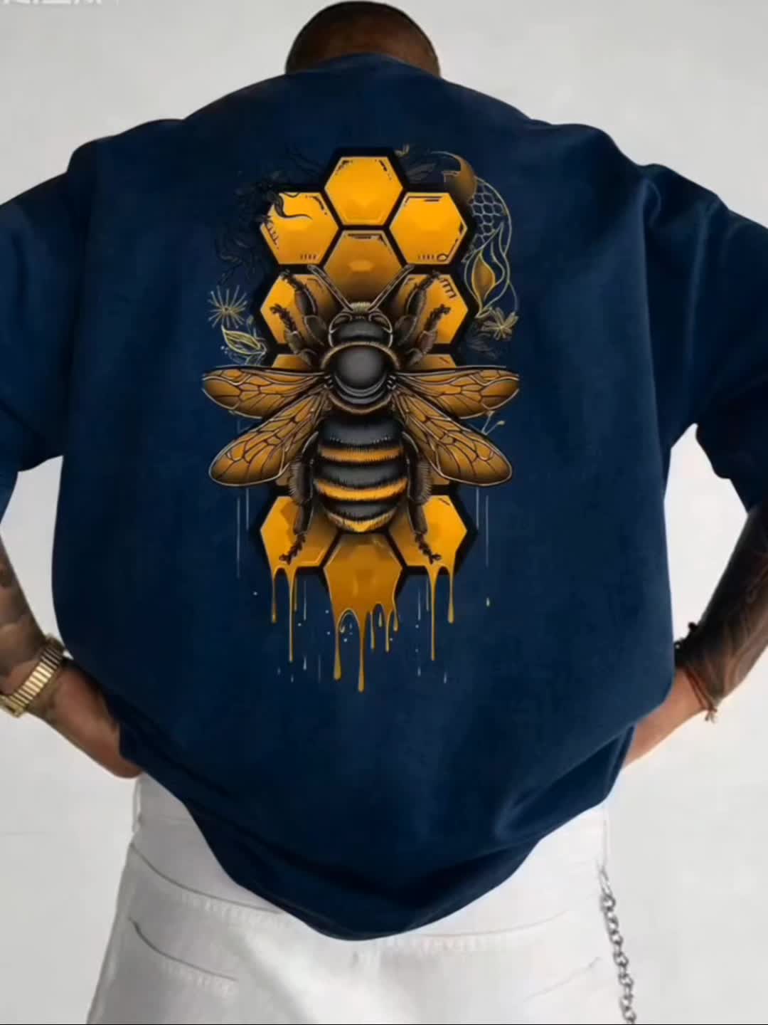 Men's Casual Short Sleeve T-Shirt - 100% Polyester Relaxed Fit Bee Print Graphic Tee with Honeycomb & Dripping Wax Design, Small Round Neck Summer Outdoor Top for Men, Durable Fabric Shirt