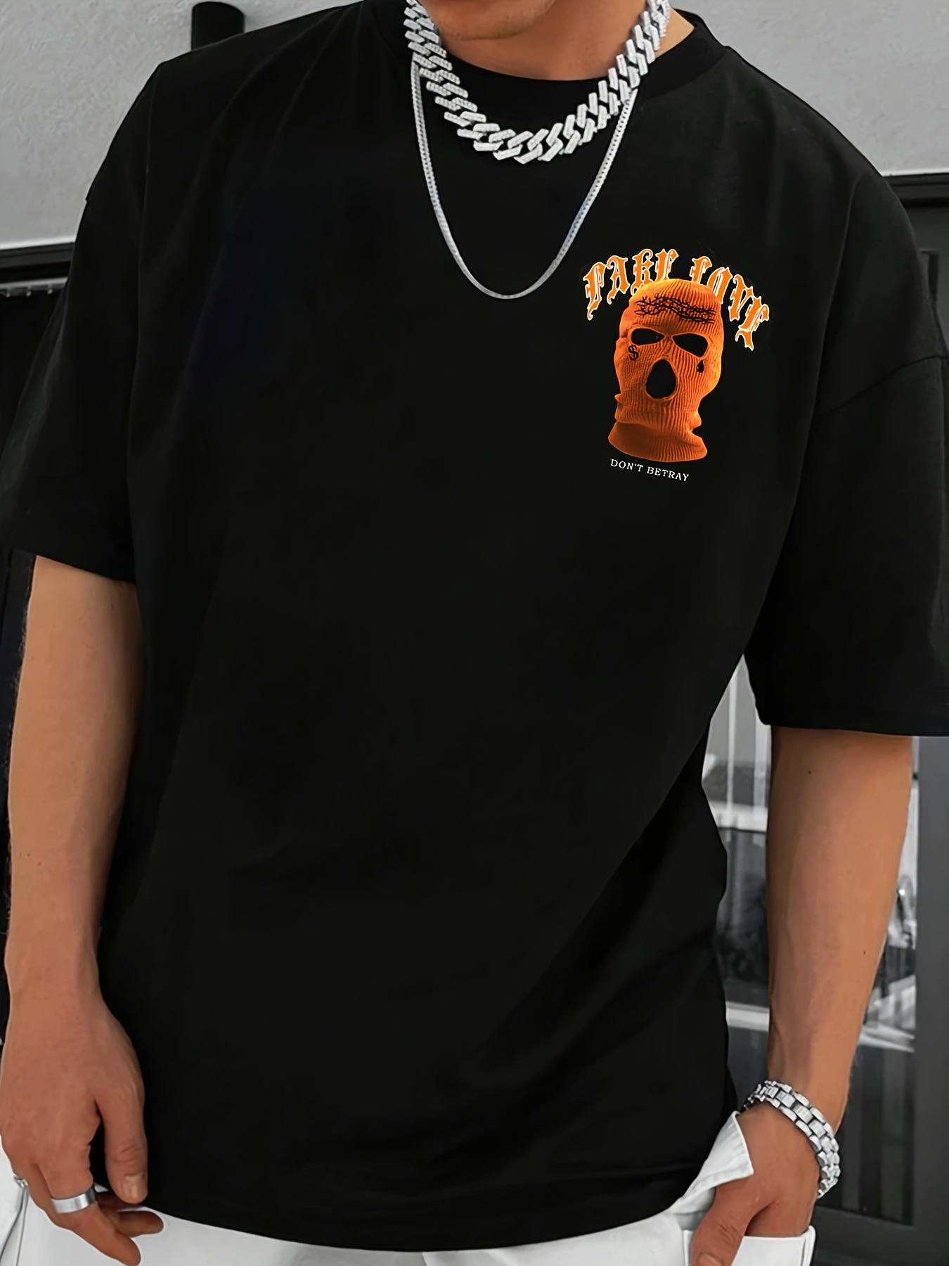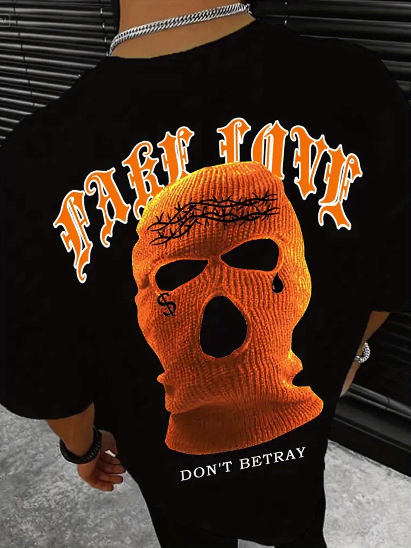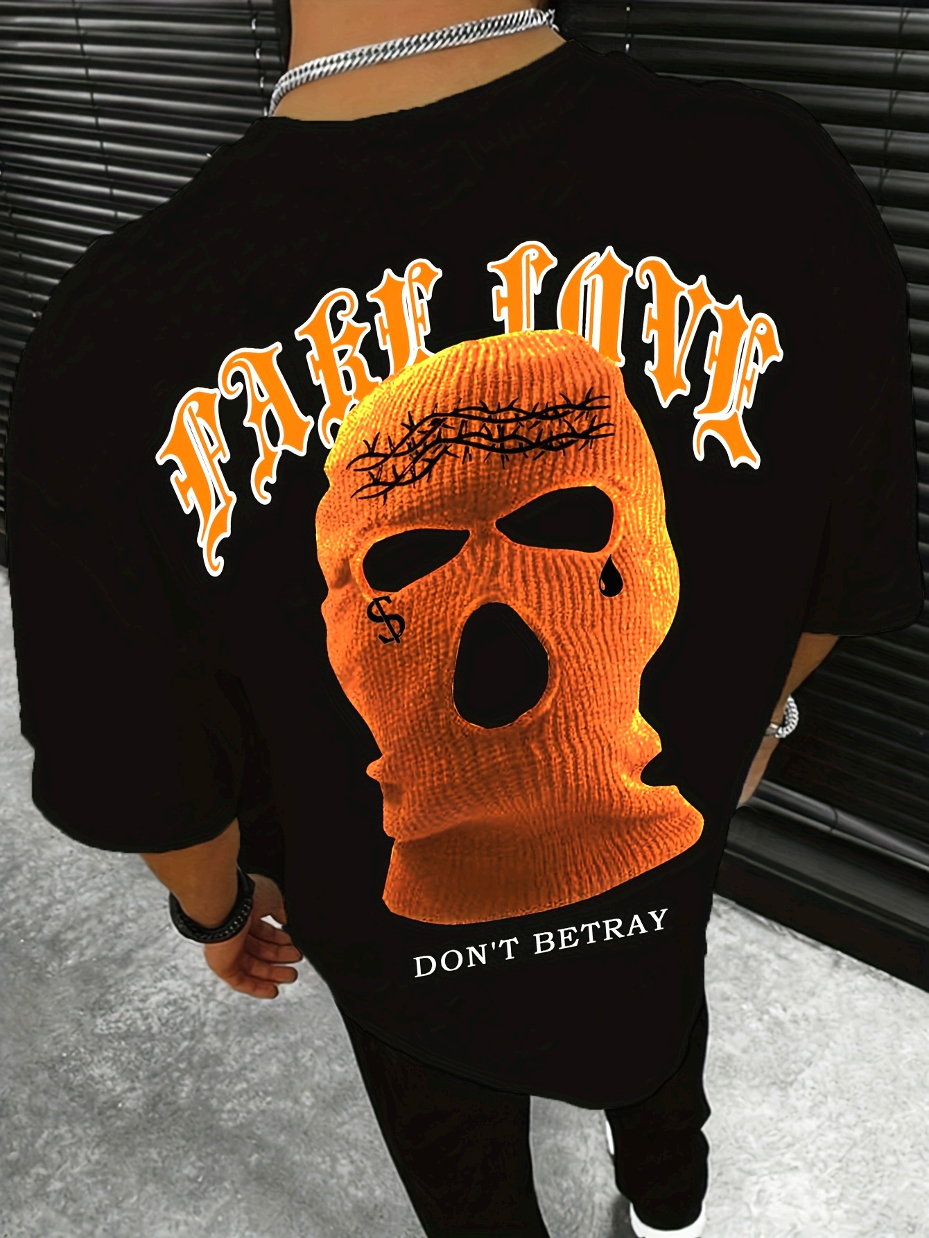 Men's Summer Street Style Graphic Tee - Bold "Fall in Love" Print, Orange Mask Design, 100% Polyester, Round Neck, Short Sleeve, Machine Washable, Bold Typography & Bandana Pattern