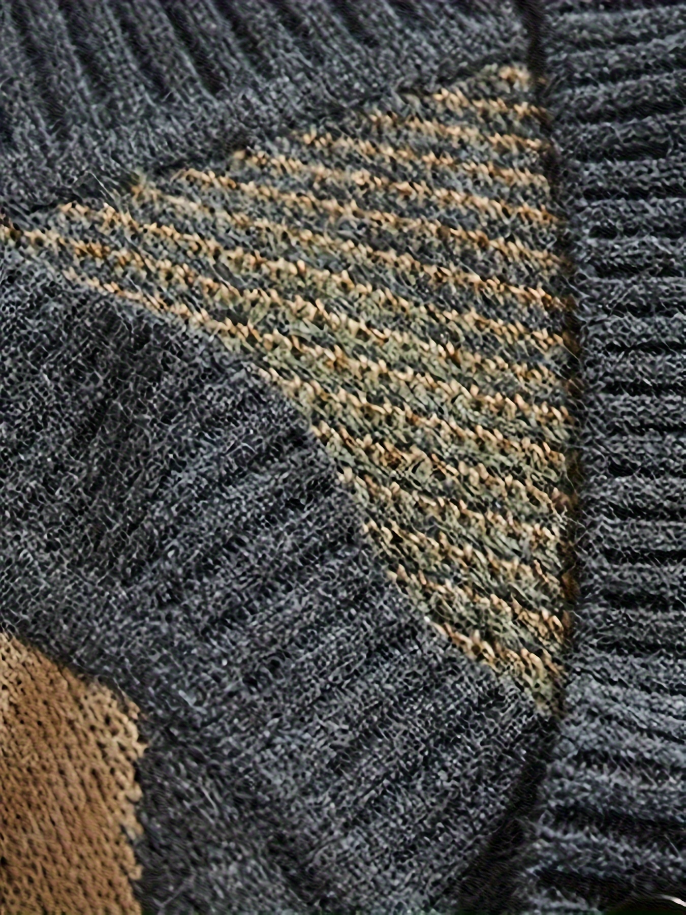 Preppy Geometric-Pattern Knit Cardigan, 80% Acrylic 20% Nylon, V-Neck Long Sleeve Loose-Fit, Slight Stretch, Spring/Fall Season Outerwear