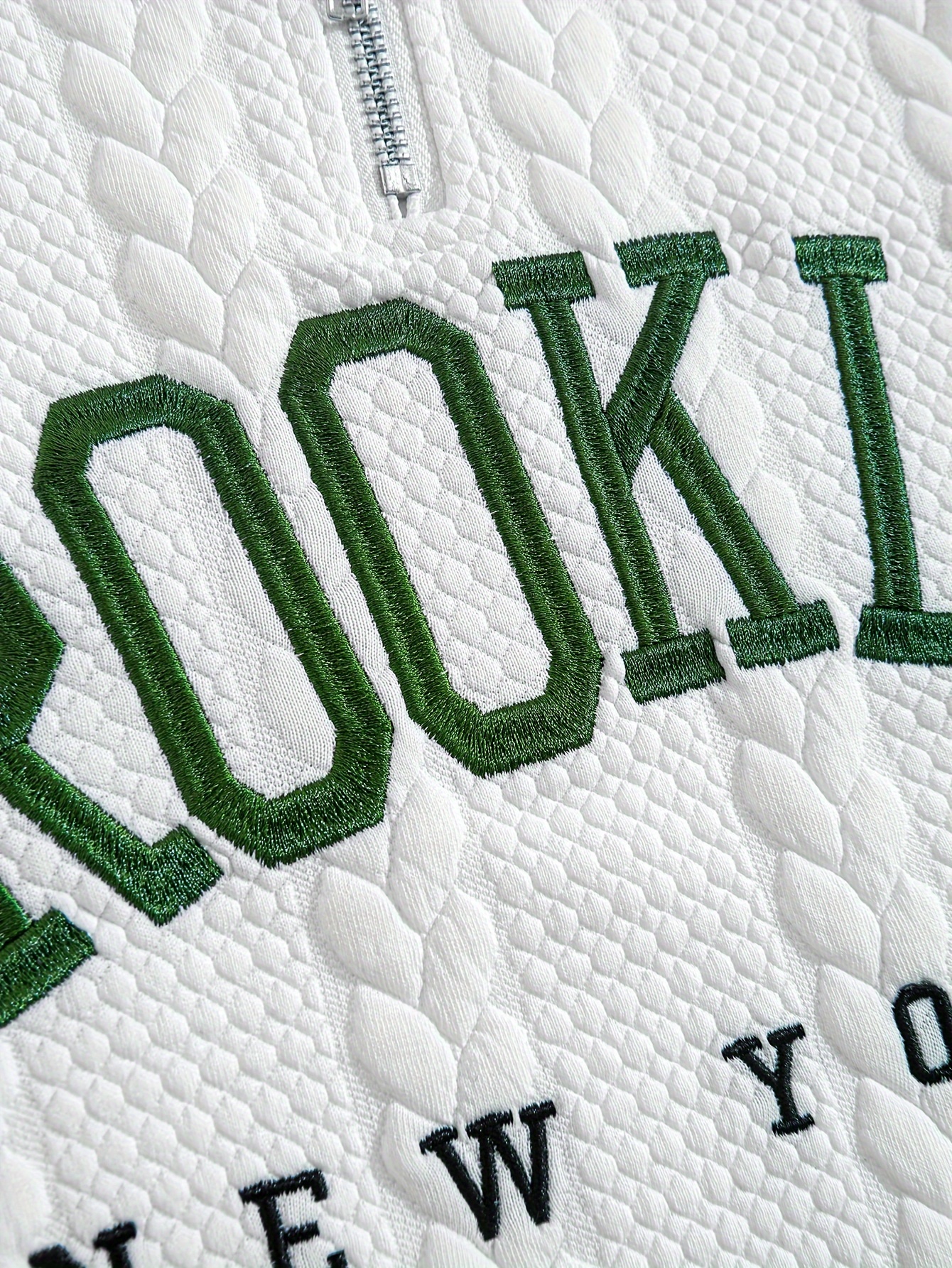 Jacquard Preppy Collared Neck Long Sleeve Embroidered Loose Fit Regular Length Knit Fabric Hoodie