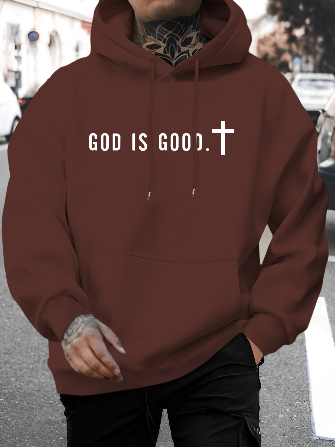 [Men's Cross Print Hooded Sweatshirt] Black Men's "GOD IS GOOD" & Cross Print Hooded Sweatshirt | Regular Fit, Casual Long Sleeve Pullover, Autumn Winter Warmth, Comfortable Versatile Casual Attire