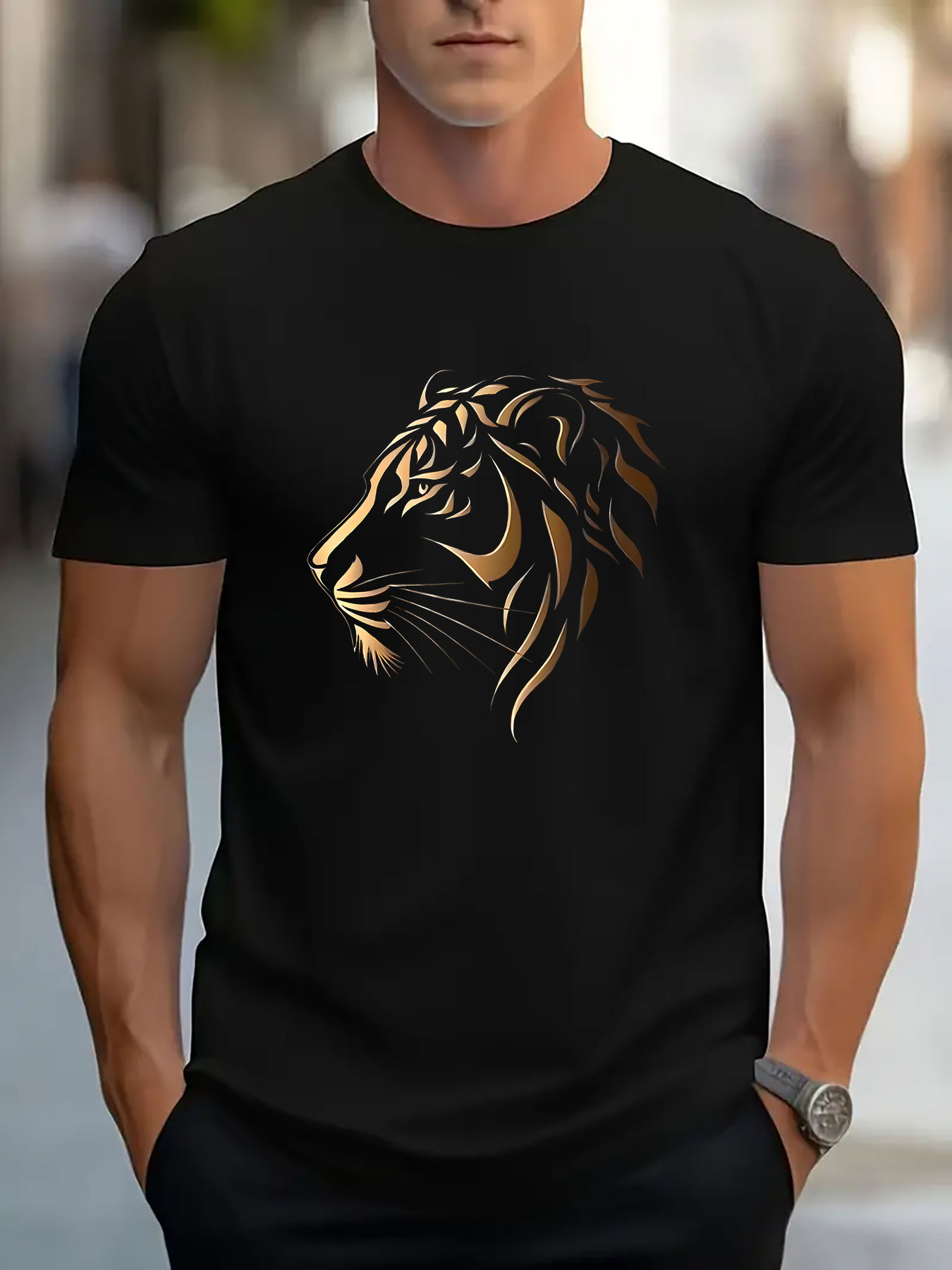 Men'S Stylish Lion Graphic T-Shirt - Brown with Golden Accent Design, Casual Summer Wear, Lightweight Polyester Fabric, Round Neck, Machine Washable, Casual Summer Top|Round Neck Shirt|Polyester Fabric