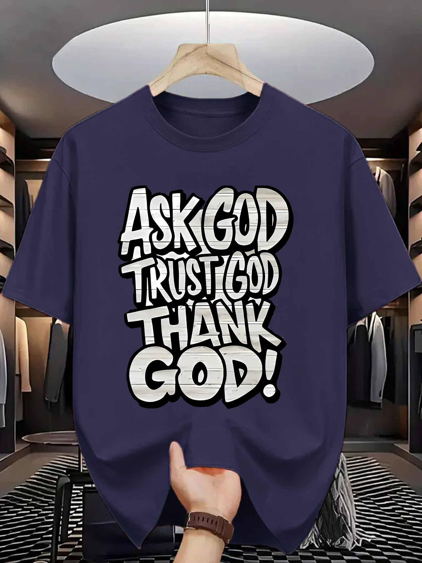 Men's Casual Short Sleeve T-Shirt with Bold "ASK GOD TRUST GOD THANK GOD" Print - Brown with White Lettering, Round Neck, Regular Fit, Machine Washable, Summer Essential for Casual Attire