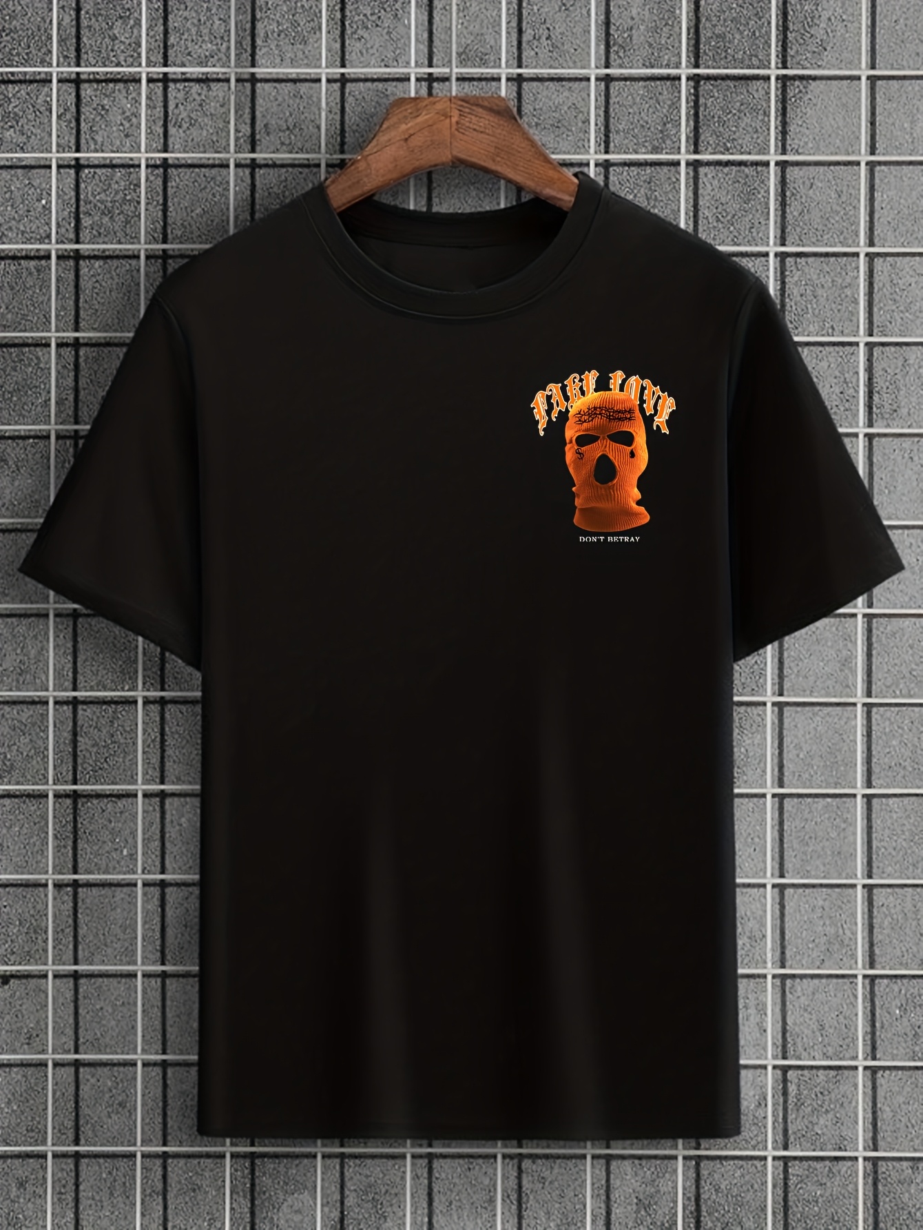 Men's Summer Street Style Graphic Tee - Bold "Fall in Love" Print, Orange Mask Design, 100% Polyester, Round Neck, Short Sleeve, Machine Washable, Bold Typography & Bandana Pattern