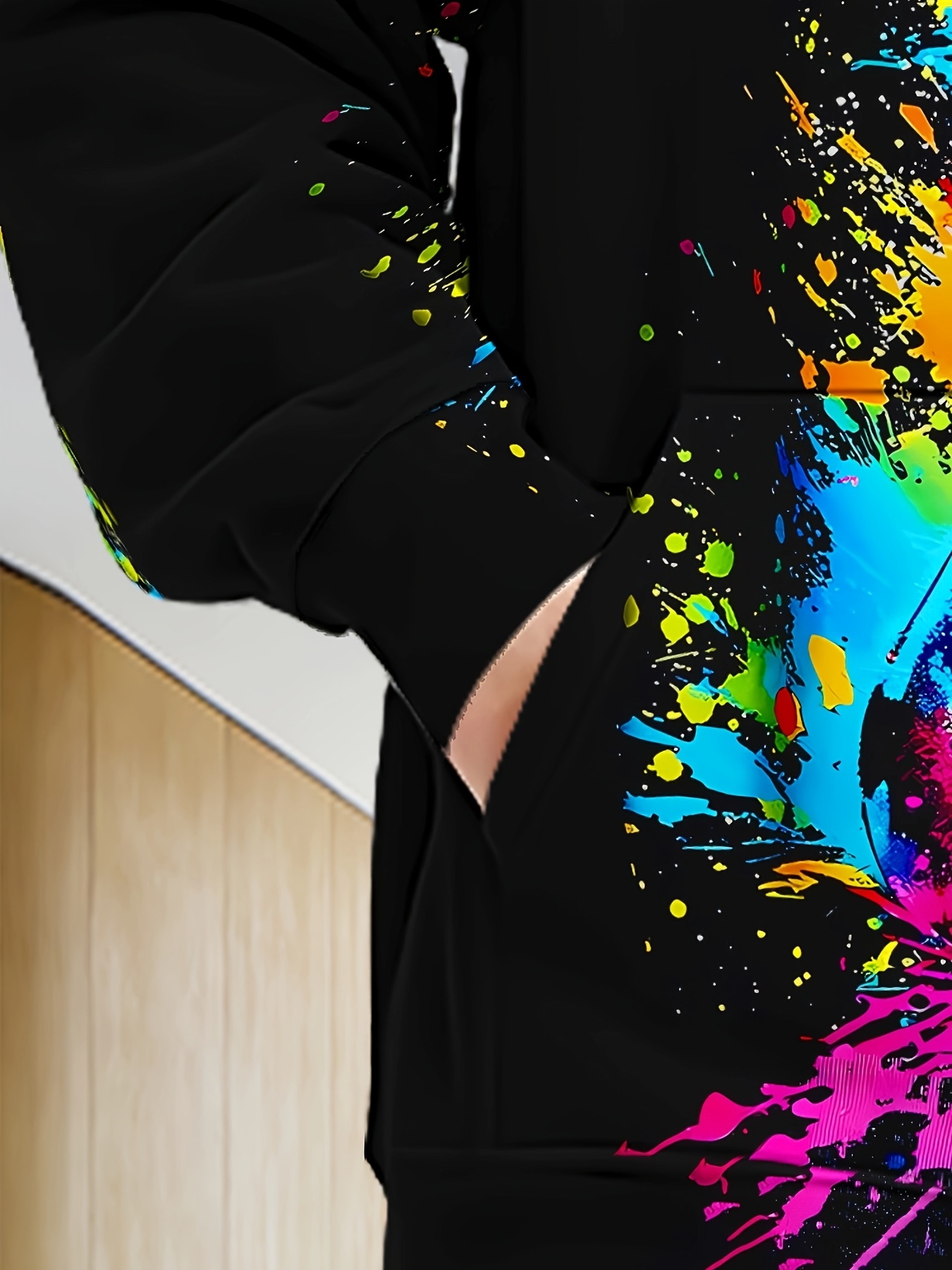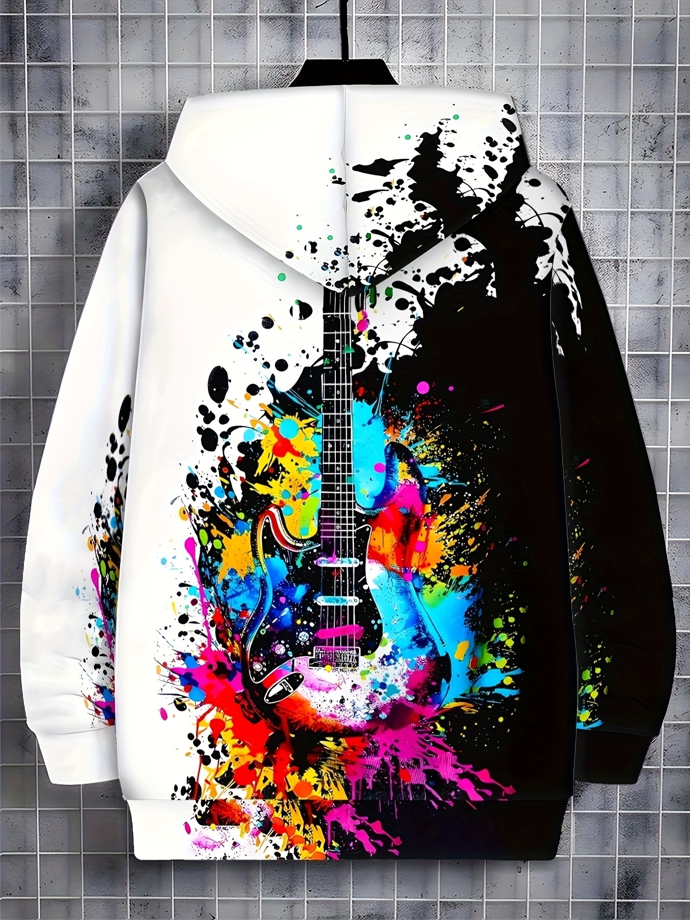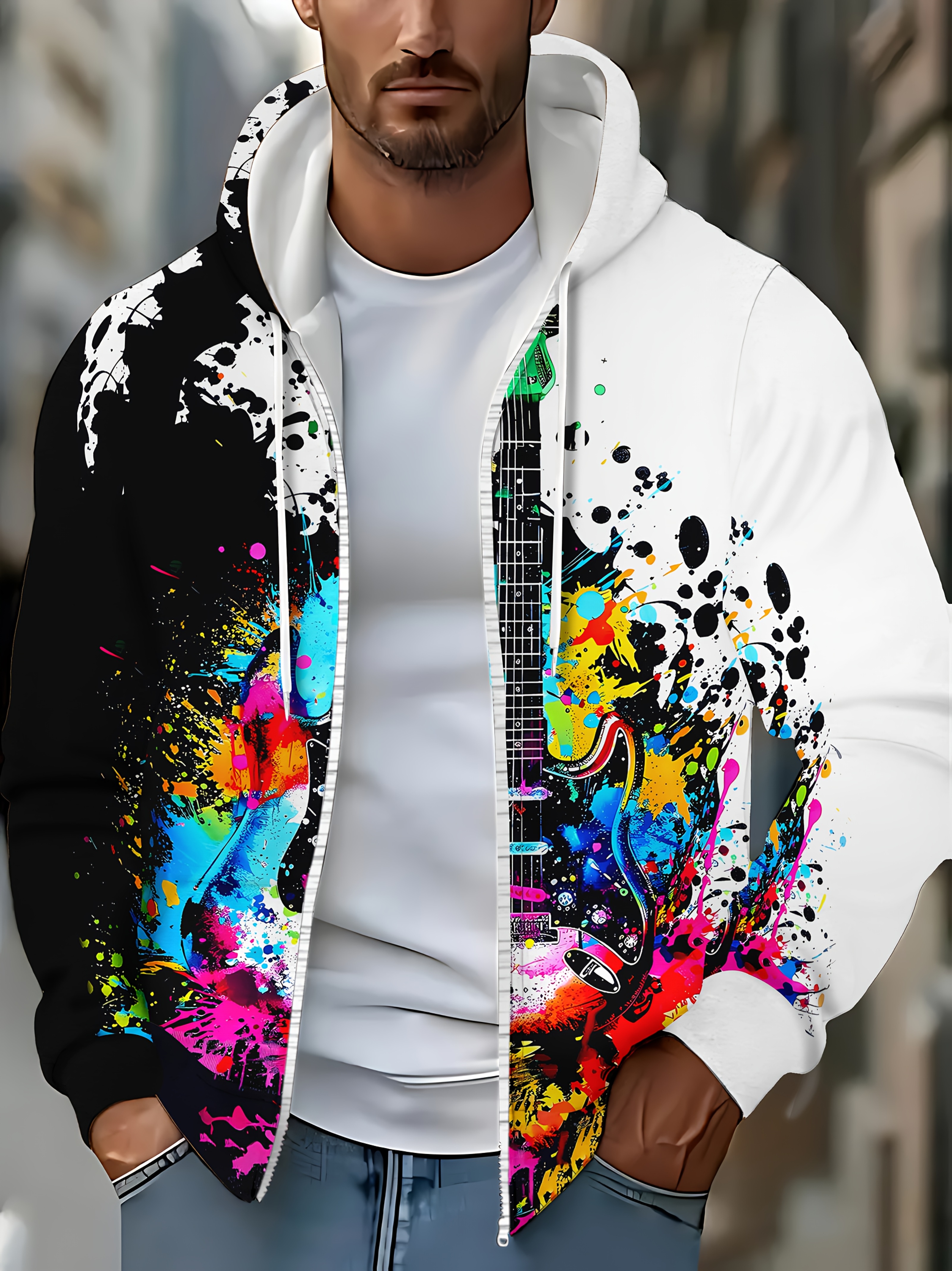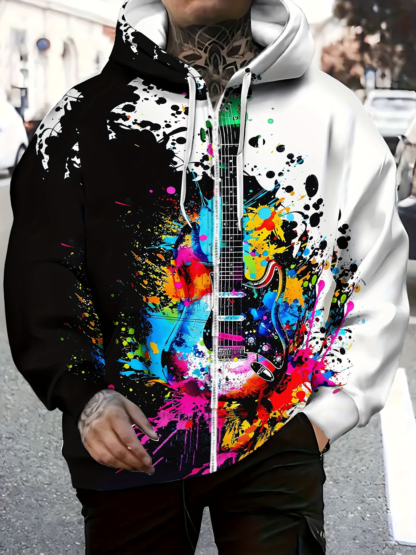 Men'S Vibrant Guitar Print Hoodie - Long Sleeve Zip-Up Sweatshirt with Drawstring & Pockets, Casual Outdoor Fall/Winter Jacket, Black with Colorful Splatter Design, Music Lover Apparel | Hooded Sweatshirt | Durable Fabric